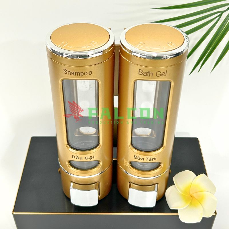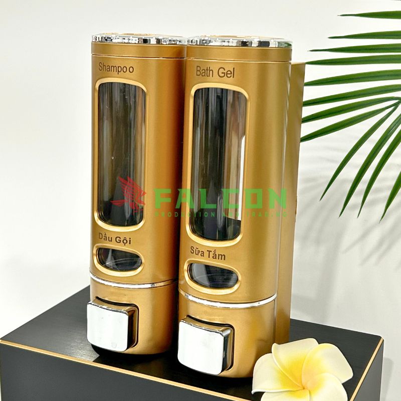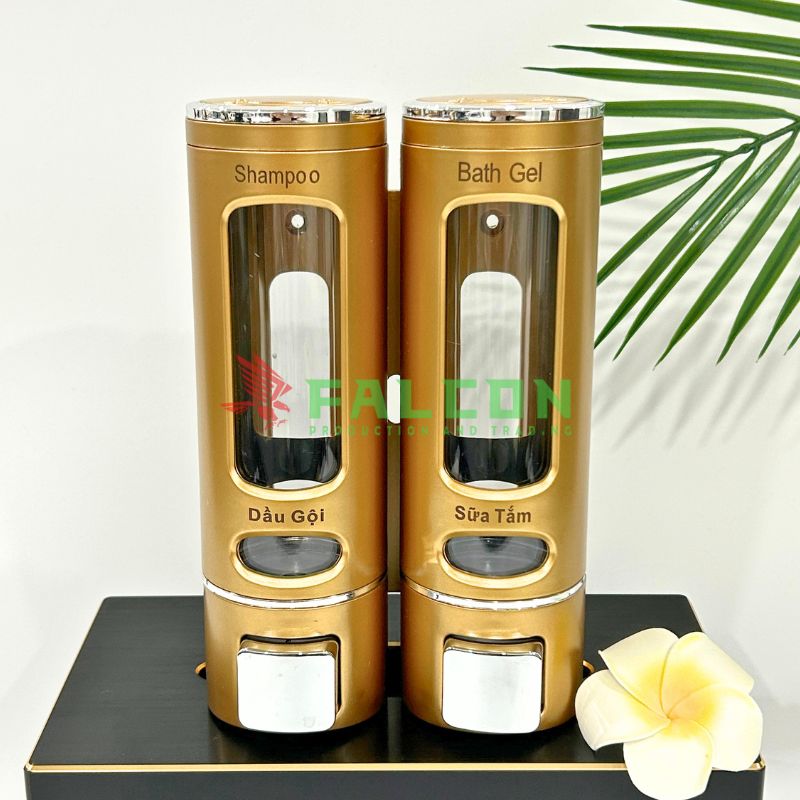 Bình dung dịch đôi Falcon được thiết kế nhằm phục vụ nhu cầu đựng dầu gội – sữa tắm đồng bộ và gọn gàng trong phòng tắm khách sạn.