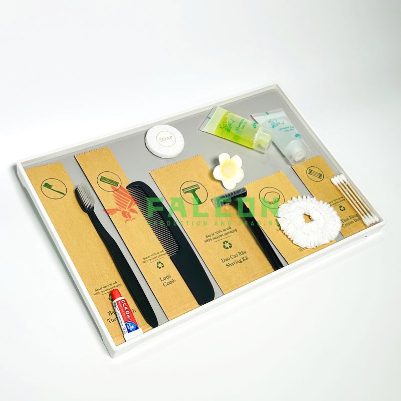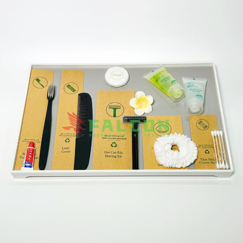 Bộ Amenities đen túi Kraft nâu là sự lựa chọn hoàn hảo dành cho những không gian lưu trú mong muốn cân bằng giữa nét sang trọng và tinh thần bền vững. Màu đen mạnh mẽ kết hợp cùng sắc nâu tự nhiên của giấy Kraft mang đến tổng thể hài hòa, vừa hiện đại vừa gần gũi thể hiện gu thẩm mỹ tinh tế và chuyên nghiệp của khách sạn.