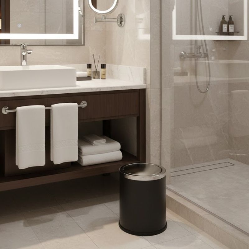Trong khách sạn, nhiều khi chính những thứ nhỏ nhỏ lại ảnh hưởng khá nhiều đến cảm nhận của khách ở. Một chiếc thùng rác nắp bập bênh nhìn thì đơn giản, nhưng dùng lại rất tiện, giúp bỏ rác dễ dàng, hạn chế mùi và giữ không gian luôn sạch sẽ. Nhờ vậy, khách sạn trông gọn gàng hơn, tạo cảm giác chỉn chu và chuyên nghiệp hơn trong mắt khách lưu trú.